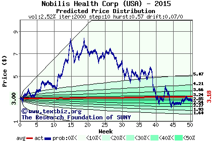 The high to date and low to date prices of the stock plotted against a random walk model for 2015 (what's this?).