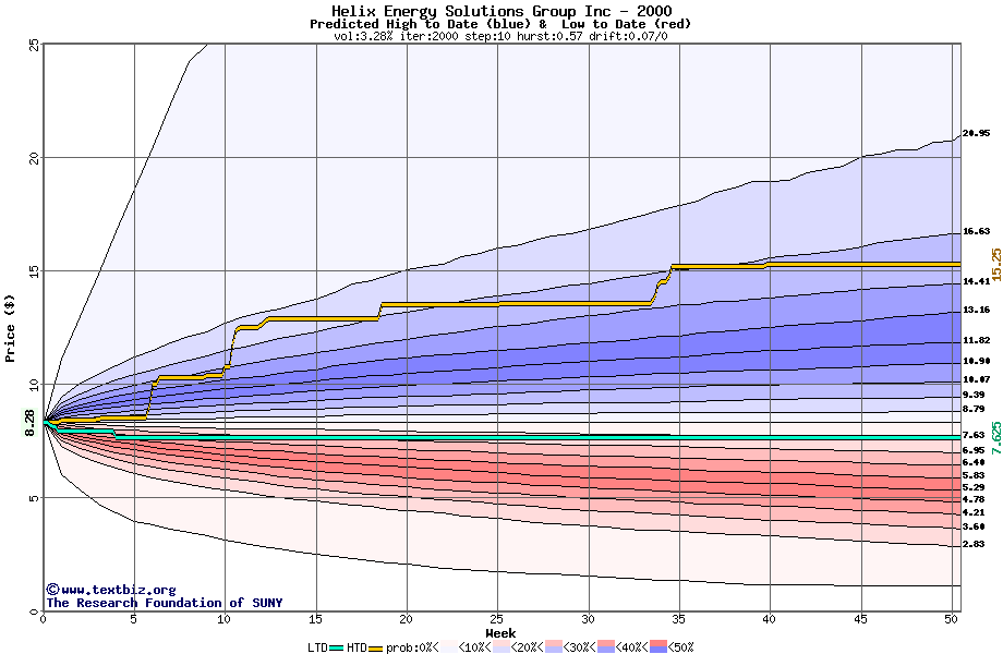 The high to date and low to date prices of the stock plotted against a random walk model for 2000 (what's this?).