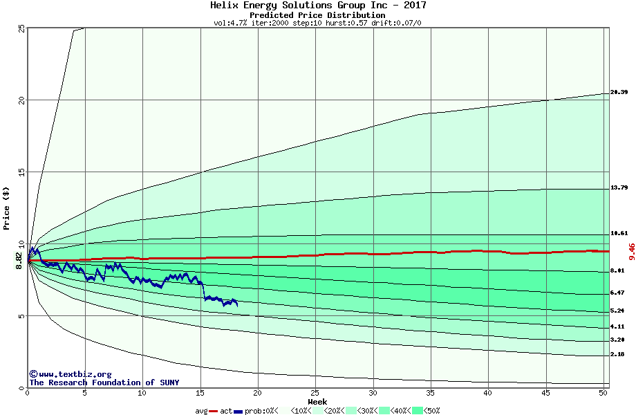 The high to date and low to date prices of the stock plotted against a random walk model for 2017 (what's this?).