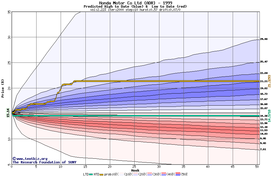 The high to date and low to date prices of the stock plotted against a random walk model for 1999 (what's this?).