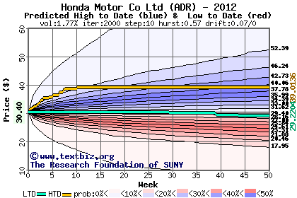 The high to date and low to date prices of the stock plotted against a random walk model for 2012 (what's this?).