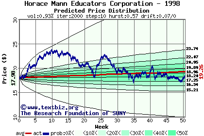 The high to date and low to date prices of the stock plotted against a random walk model for 1998 (what's this?).