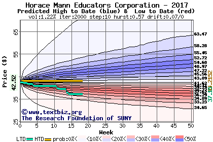 The high to date and low to date prices of the stock plotted against a random walk model for 2017 (what's this?).
