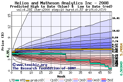The high to date and low to date prices of the stock plotted against a random walk model for 2008 (what's this?).