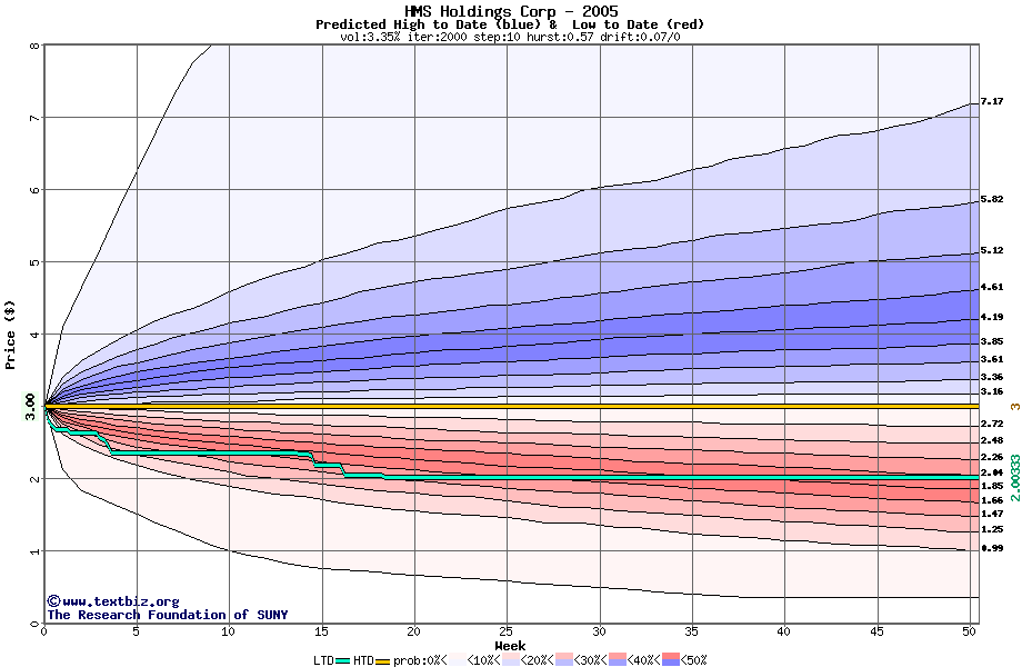 The high to date and low to date prices of the stock plotted against a random walk model for 2005 (what's this?).