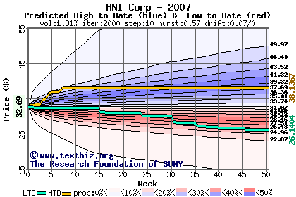 The high to date and low to date prices of the stock plotted against a random walk model for 2007 (what's this?).