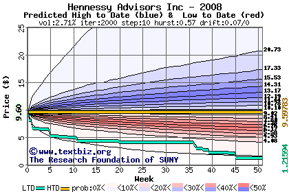 The high to date and low to date prices of the stock plotted against a random walk model for 2008 (what's this?).