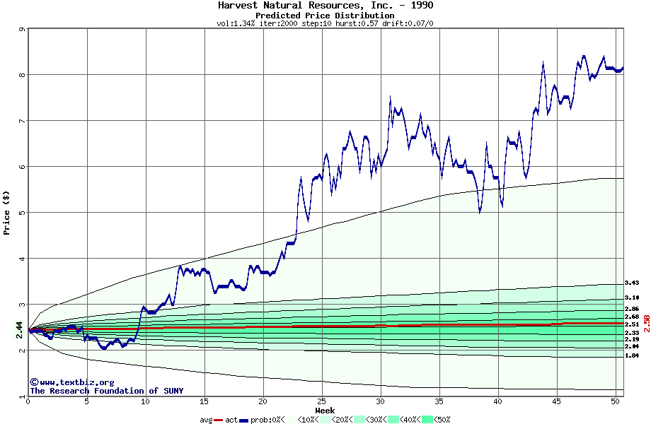 The following graph plots the year-to-date performance of the stock for 1990 compared to the probability calculated by a random walk model.