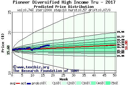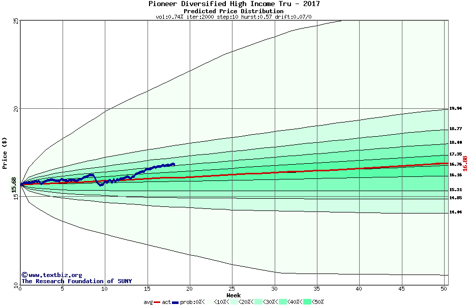 The high to date and low to date prices of the stock plotted against a random walk model for 2017 (what's this?).