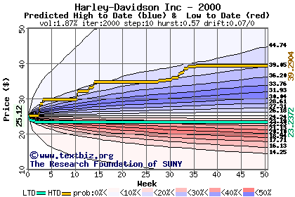 The high to date and low to date prices of the stock plotted against a random walk model for 2000 (what's this?).