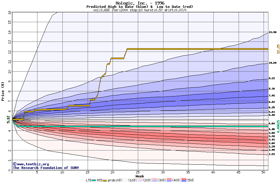 The high to date and low to date prices of the stock plotted against a random walk model for 1996 (what's this?).