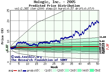 The following graph plots the year-to-date performance of the stock for 2005 compared to the probability calculated by a random walk model.