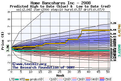 The high to date and low to date prices of the stock plotted against a random walk model for 2008 (what's this?).