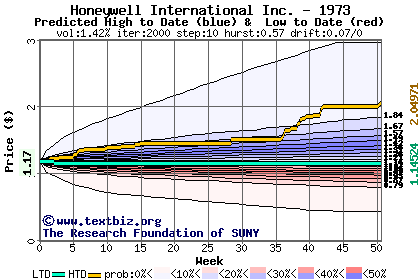 The following graph plots the year-to-date performance of the stock for 1973 compared to the probability calculated by a random walk model.