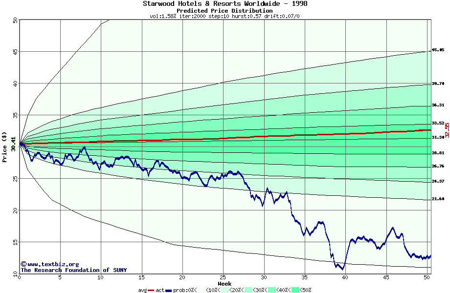 The following graph plots the year-to-date performance of the stock for 1998 compared to the probability calculated by a random walk model.