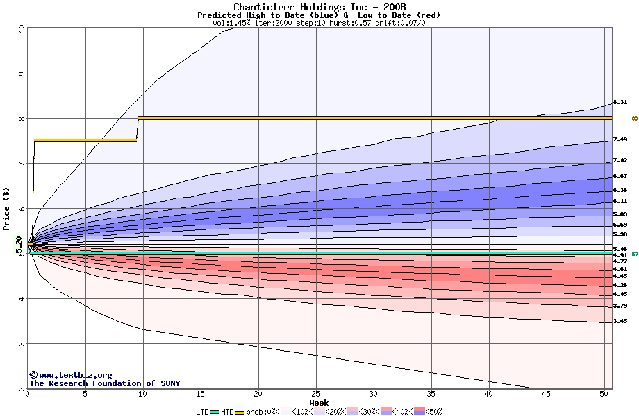 The high to date and low to date prices of the stock plotted against a random walk model for 2008 (what's this?).