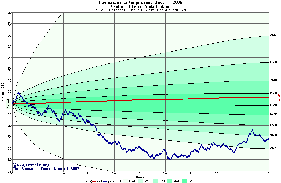 The following graph plots the year-to-date performance of the stock for 2006 compared to the probability calculated by a random walk model.