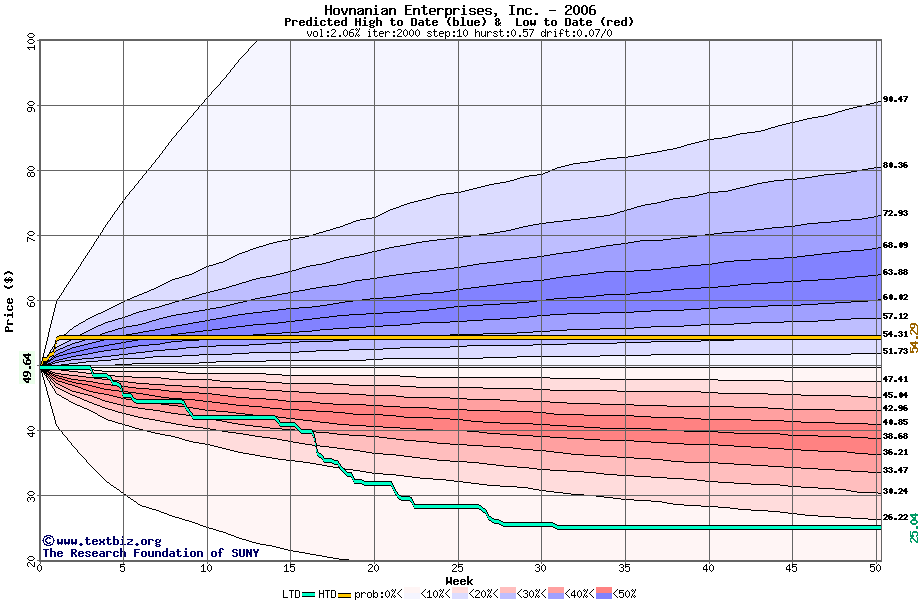 The high to date and low to date prices of the stock plotted against a random walk model for 2006 (what's this?).