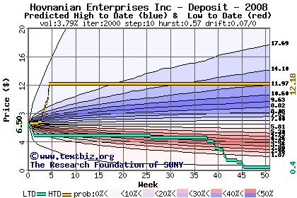 The high to date and low to date prices of the stock plotted against a random walk model for 2008 (what's this?).