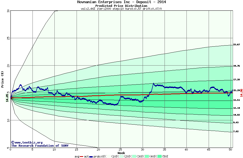 The high to date and low to date prices of the stock plotted against a random walk model for 2014 (what's this?).