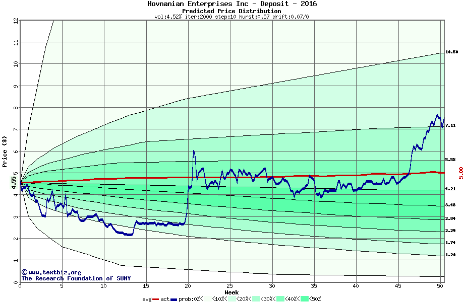 The high to date and low to date prices of the stock plotted against a random walk model for 2016 (what's this?).