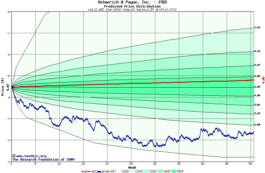 The high to date and low to date prices of the stock plotted against a random walk model for 1982 (what's this?).