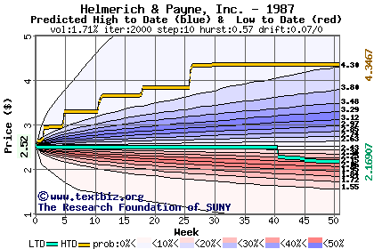 The high to date and low to date prices of the stock plotted against a random walk model for 1987 (what's this?).