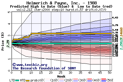 The high to date and low to date prices of the stock plotted against a random walk model for 1988 (what's this?).