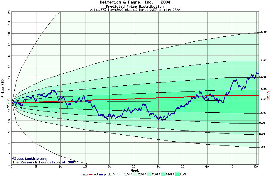 The following graph plots the year-to-date performance of the stock for 2004 compared to the probability calculated by a random walk model.