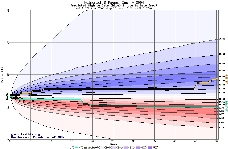 The high to date and low to date prices of the stock plotted against a random walk model for 2004 (what's this?).
