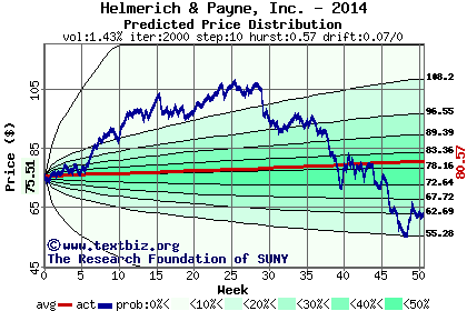 The high to date and low to date prices of the stock plotted against a random walk model for 2014 (what's this?).