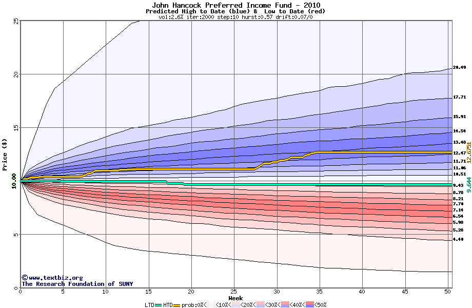 The high to date and low to date prices of the stock plotted against a random walk model for 2010 (what's this?).