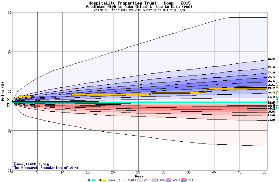 The high to date and low to date prices of the stock plotted against a random walk model for 2015 (what's this?).