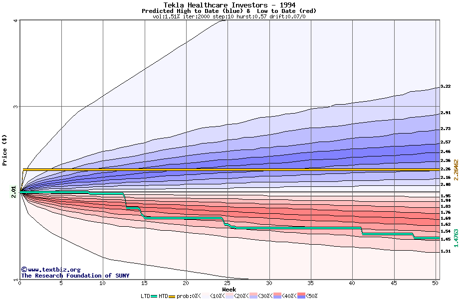 The high to date and low to date prices of the stock plotted against a random walk model for 1994 (what's this?).
