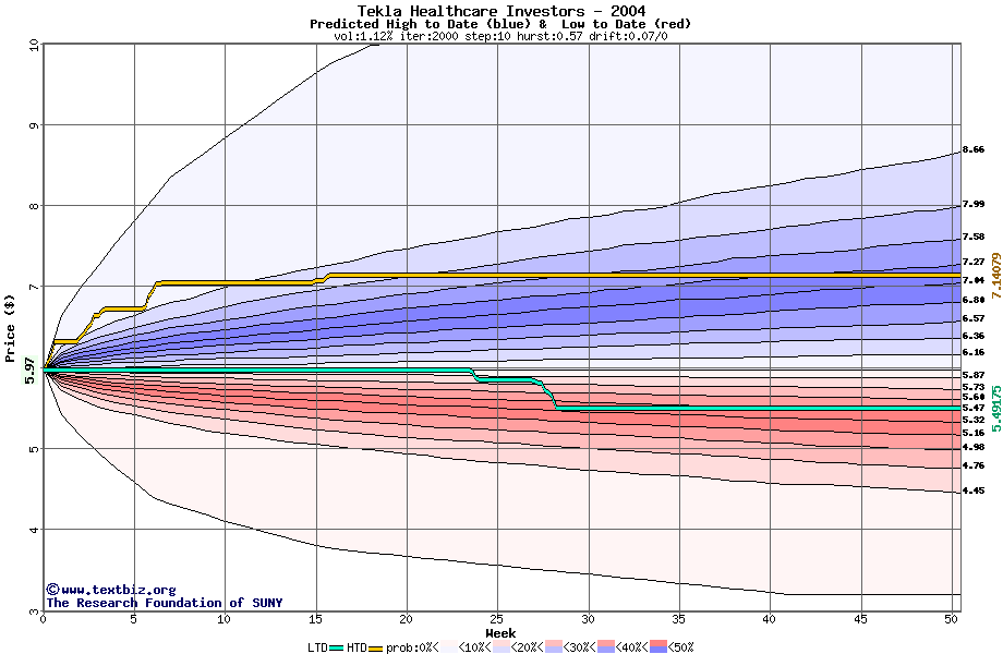 The high to date and low to date prices of the stock plotted against a random walk model for 2004 (what's this?).