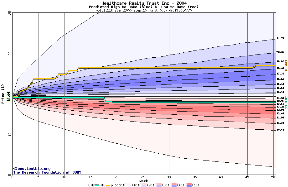 The high to date and low to date prices of the stock plotted against a random walk model for 2004 (what's this?).