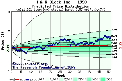 The high to date and low to date prices of the stock plotted against a random walk model for 1990 (what's this?).