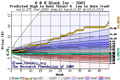 The high to date and low to date prices of the stock plotted against a random walk model for 2001 (what's this?).