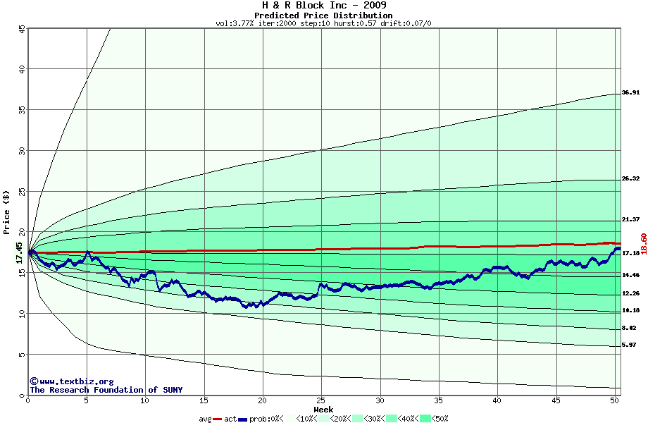 The following graph plots the year-to-date performance of the stock for 2009 compared to the probability calculated by a random walk model.