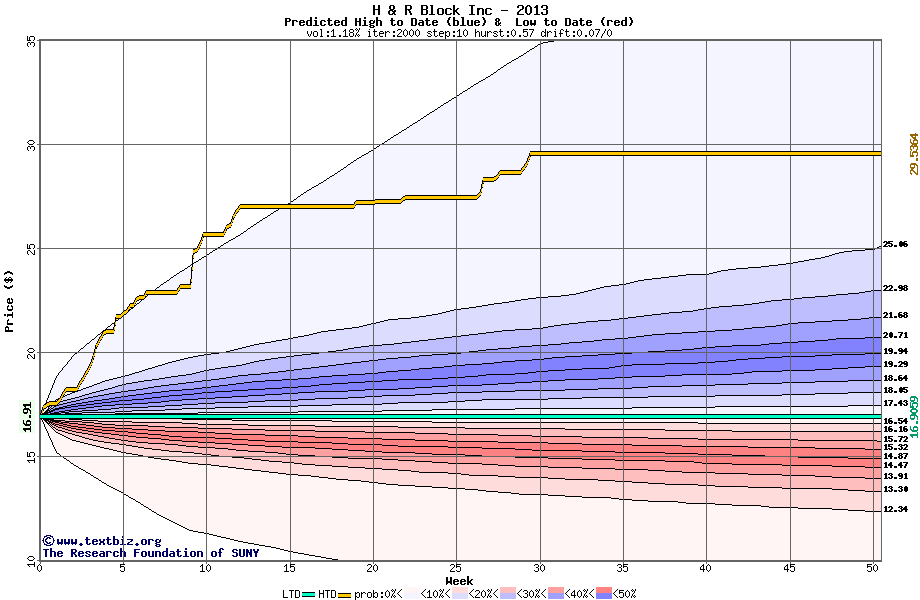The following graph plots the year-to-date performance of the stock for 2013 compared to the probability calculated by a random walk model.