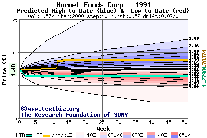 The high to date and low to date prices of the stock plotted against a random walk model for 1991 (what's this?).