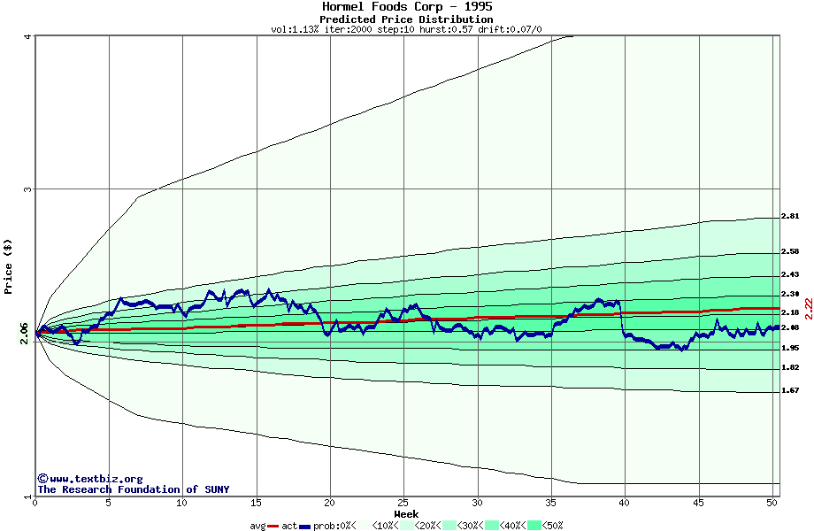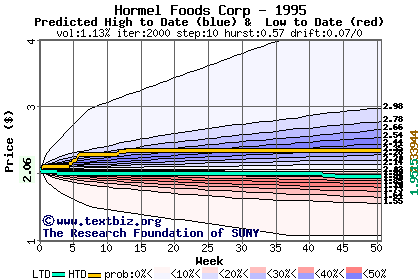The high to date and low to date prices of the stock plotted against a random walk model for 1995 (what's this?).