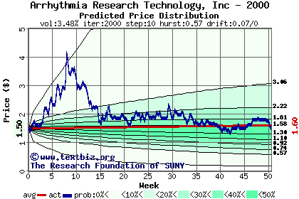 The high to date and low to date prices of the stock plotted against a random walk model for 2000 (what's this?).