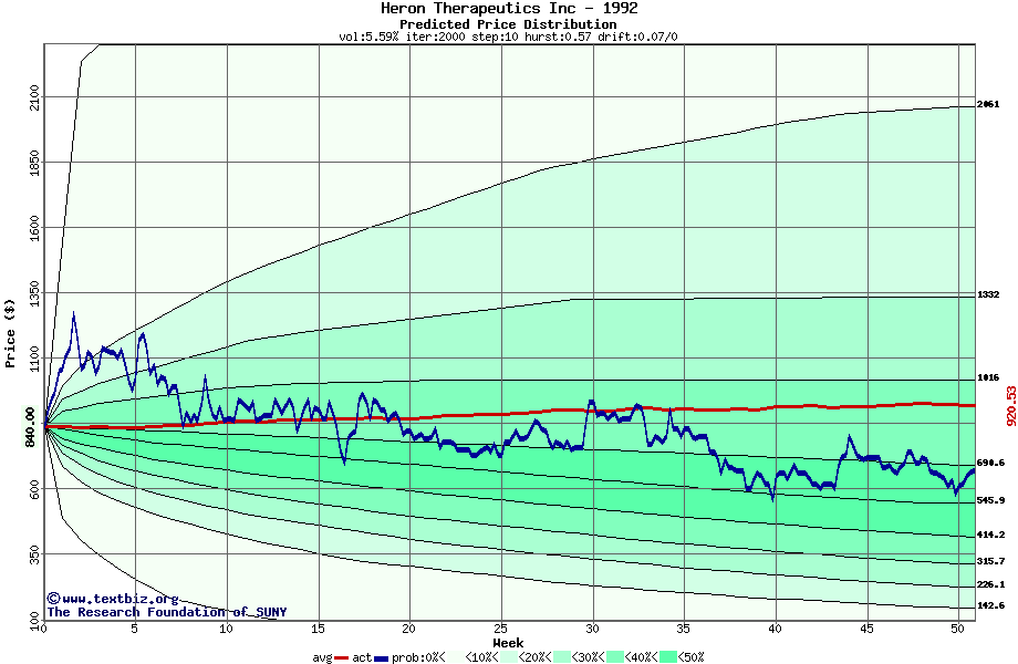 The following graph plots the year-to-date performance of the stock for 1992 compared to the probability calculated by a random walk model.
