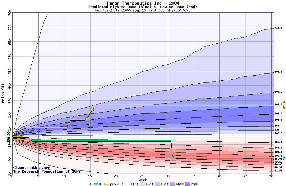 The high to date and low to date prices of the stock plotted against a random walk model for 2004 (what's this?).