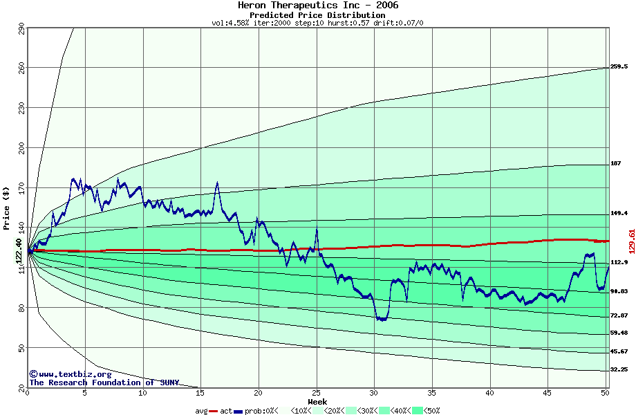 The following graph plots the year-to-date performance of the stock for 2006 compared to the probability calculated by a random walk model.
