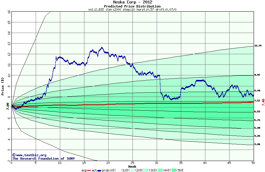 The following graph plots the year-to-date performance of the stock for 2012 compared to the probability calculated by a random walk model.