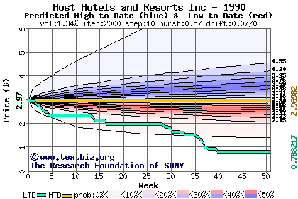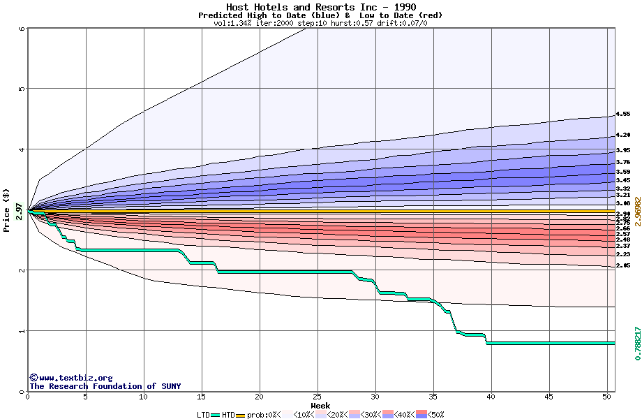 The high to date and low to date prices of the stock plotted against a random walk model for 1990 (what's this?).