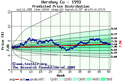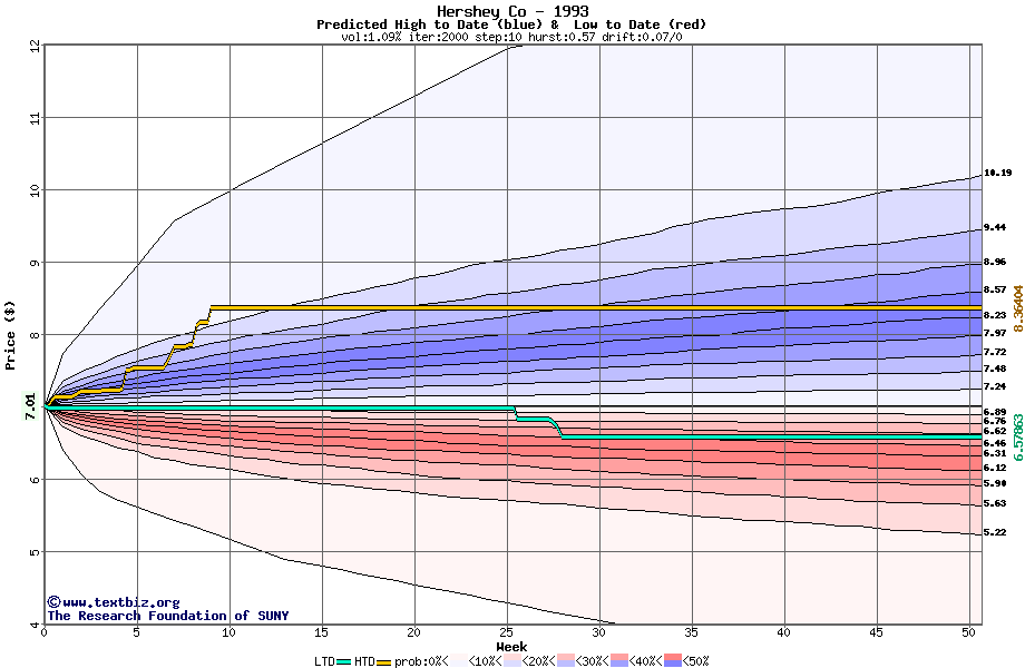 The high to date and low to date prices of the stock plotted against a random walk model for 1993 (what's this?).