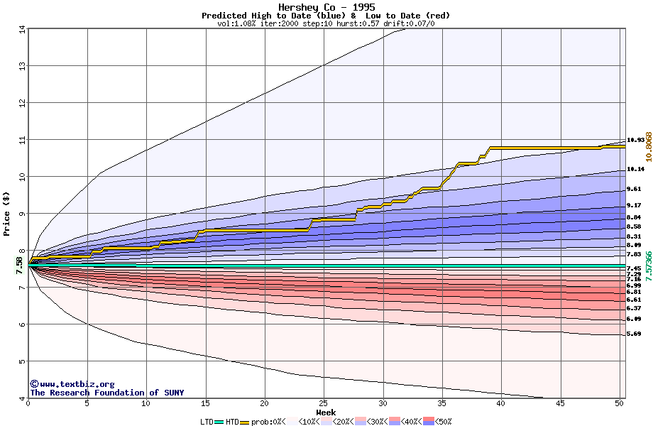 The high to date and low to date prices of the stock plotted against a random walk model for 1995 (what's this?).